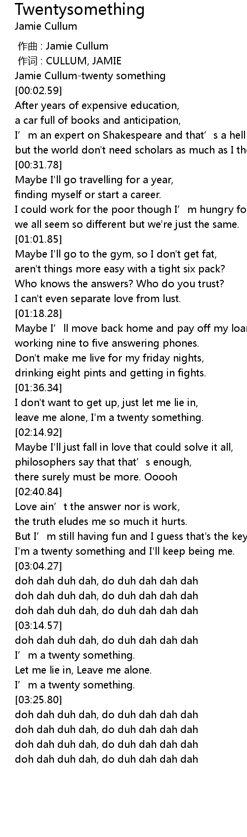 | [02:59.91] | I' m a twenty something and I' ll keep being me. |