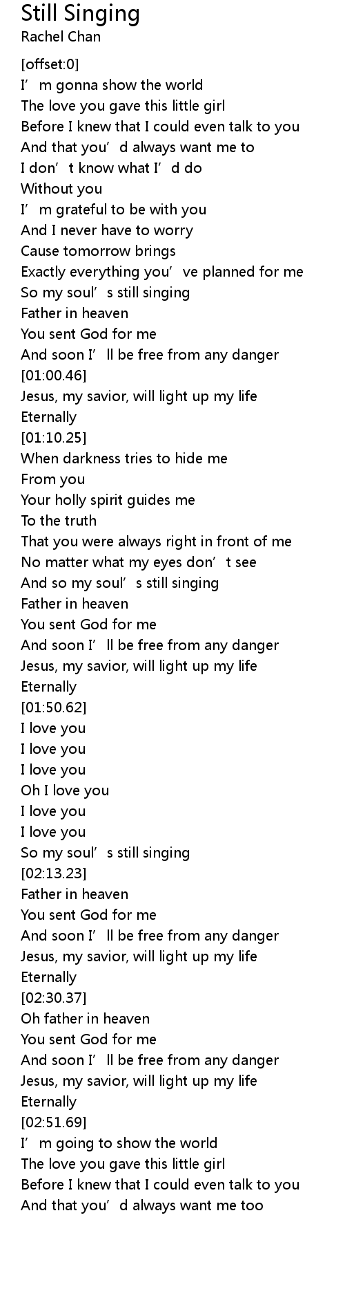 | [02:09.81] | So my soul’s still singing |