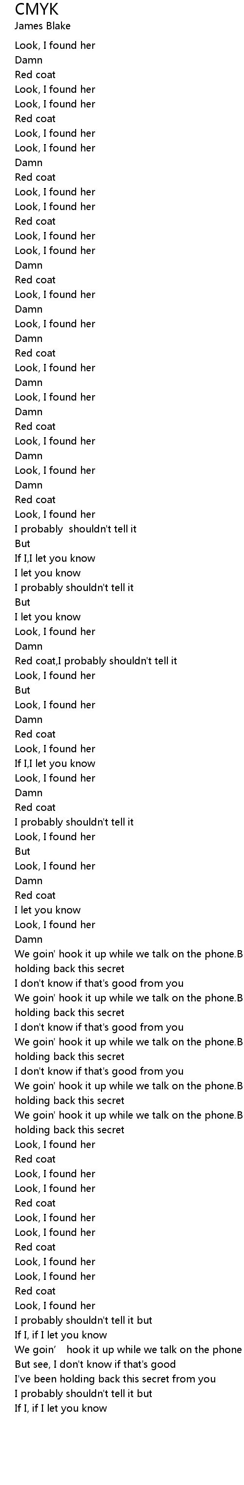 | [01:37.803] | Red coat, I probably shouldn' t tell it |