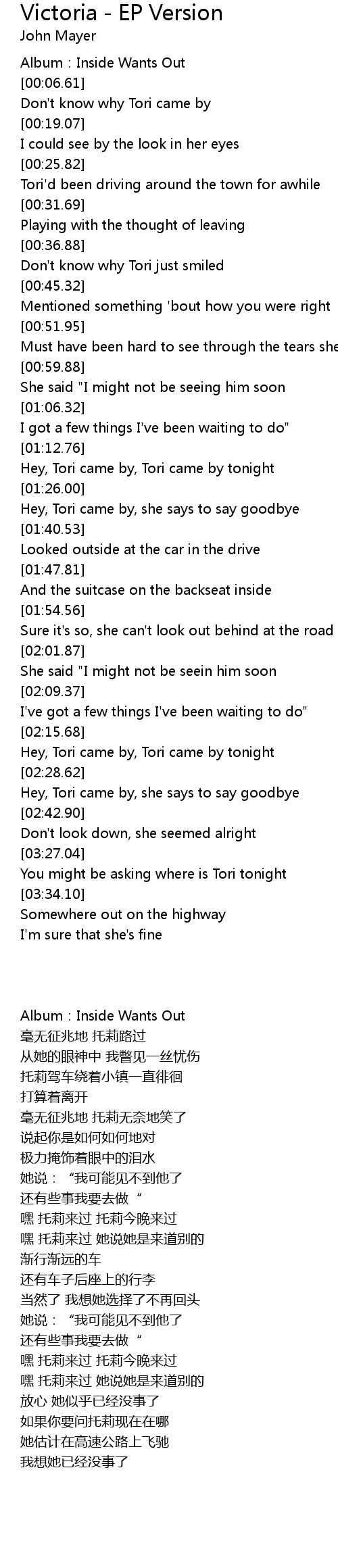 | [02:18.31] | Hey, Tori came by, Tori came by tonight |