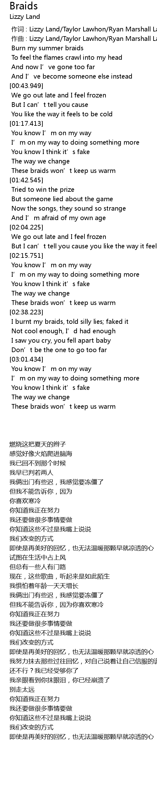 | [02:39.458] | I burnt my braids, told silly lies faked it |