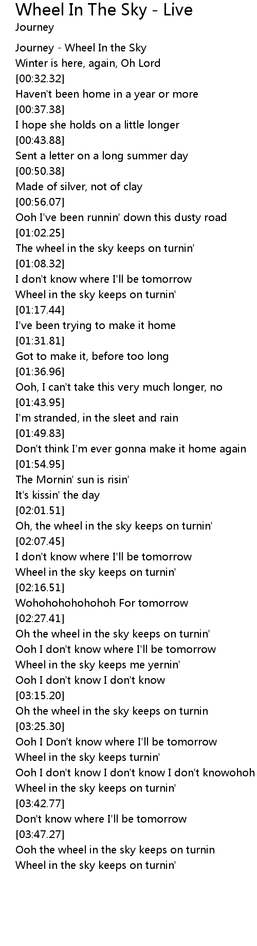 | [01:14.19] | Wheel in the sky keeps on turnin' |