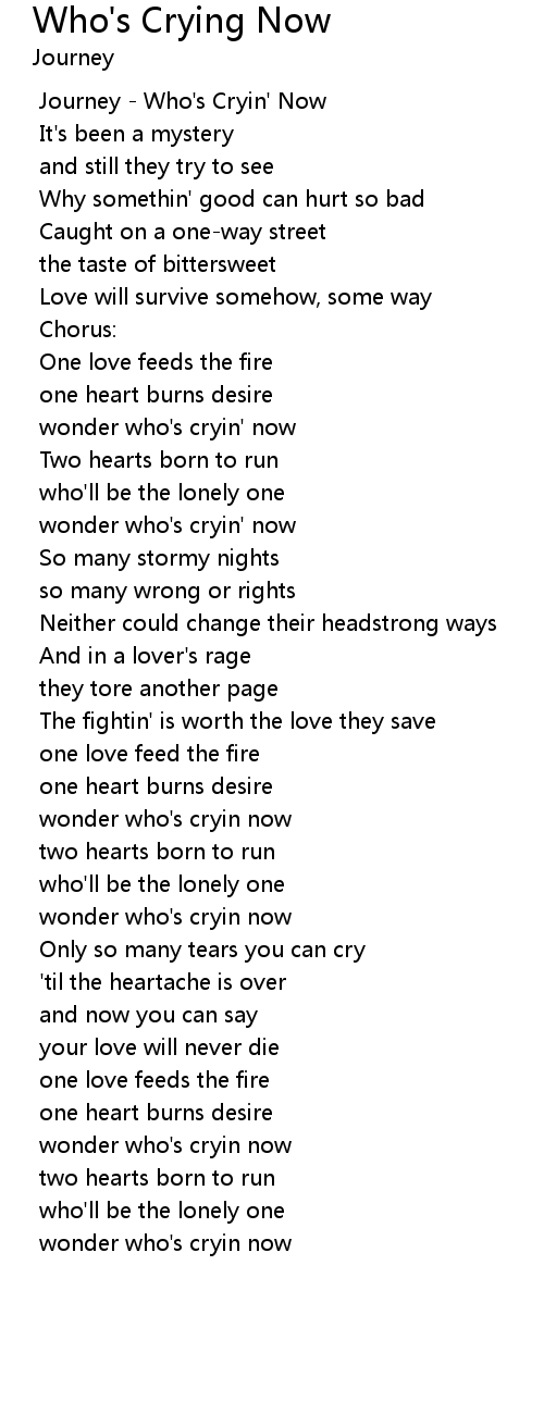 | [00:06.15] | Journey - Who's Cryin' Now |