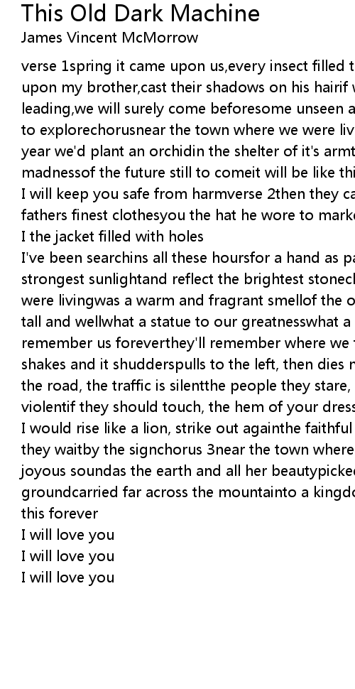 I've been searchins all these hoursfor a hand as pale as bonethat would keep the strongest sunlightand reflect the brightest stonechorus 2near the town where we were livingwas a warm and fragrant smellof the orchid we had plantednow a forest tall and wellwhat a statue to our greatnesswhat a story all will tellthey'll remember us foreverthey'll remember where we fellbridgethis old dark machine, it shakes and it shudderspulls to the left, then dies near the gutterbut still in the road, the traffic is silentthe people they stare, and then they turn violentif they should touch, the hem of your dress |