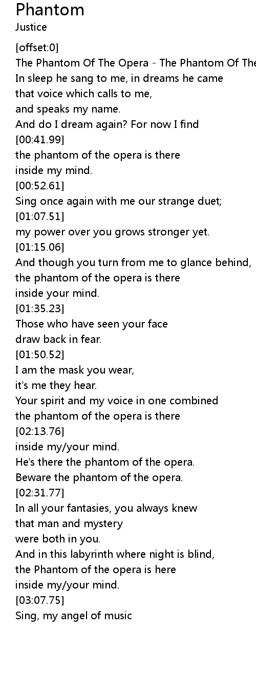 | [00:02.23] | The Phantom Of The Opera - The Phantom Of The Opera |