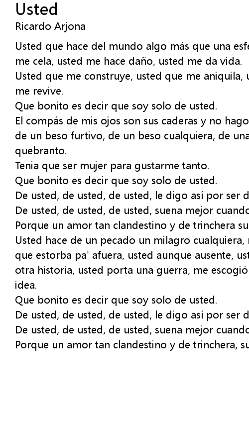 | Usted que hace del mundo algo ma s que una esfera, usted que me mira, usted que me cela, usted me hace da o, usted me da vida. | |