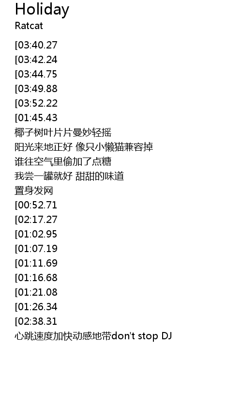 | [03:27.75][02:38.31] | 心跳加快动感地带 Holiday |