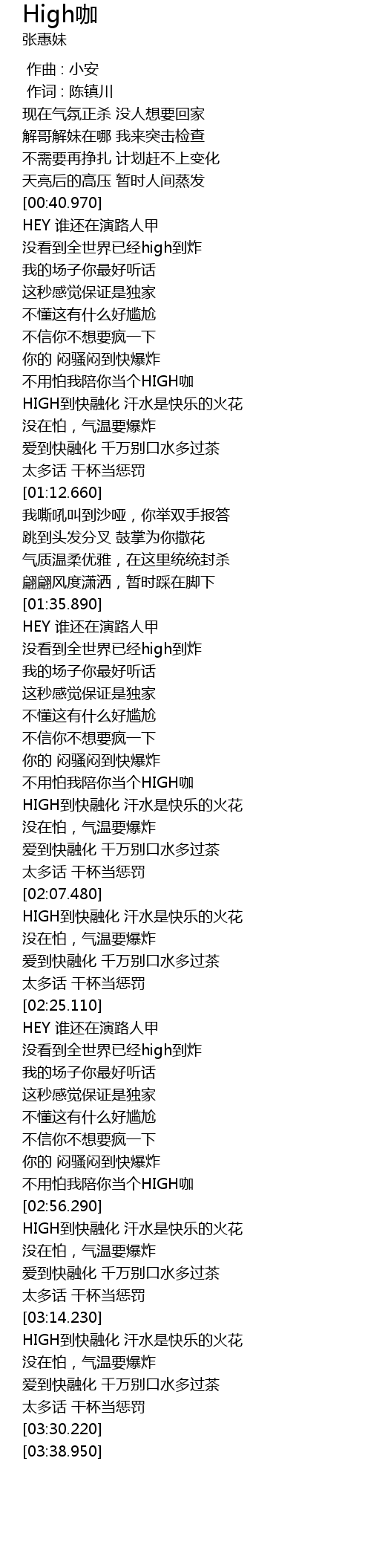 | [03:14.850] | HIGH dào kuài róng huà hàn shuǐ shì kuài lè de huǒ huā |