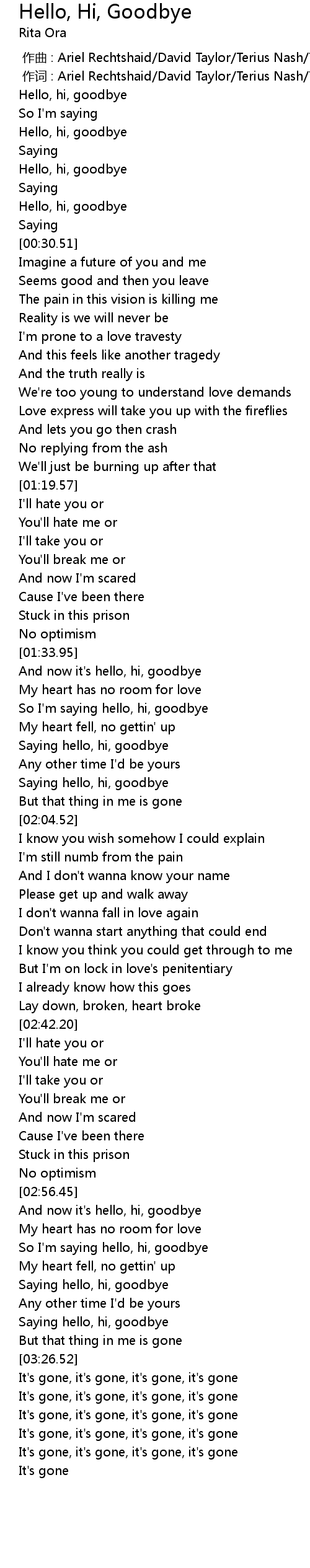 | [03:04.57] | So I' m saying hello, hi, goodbye |