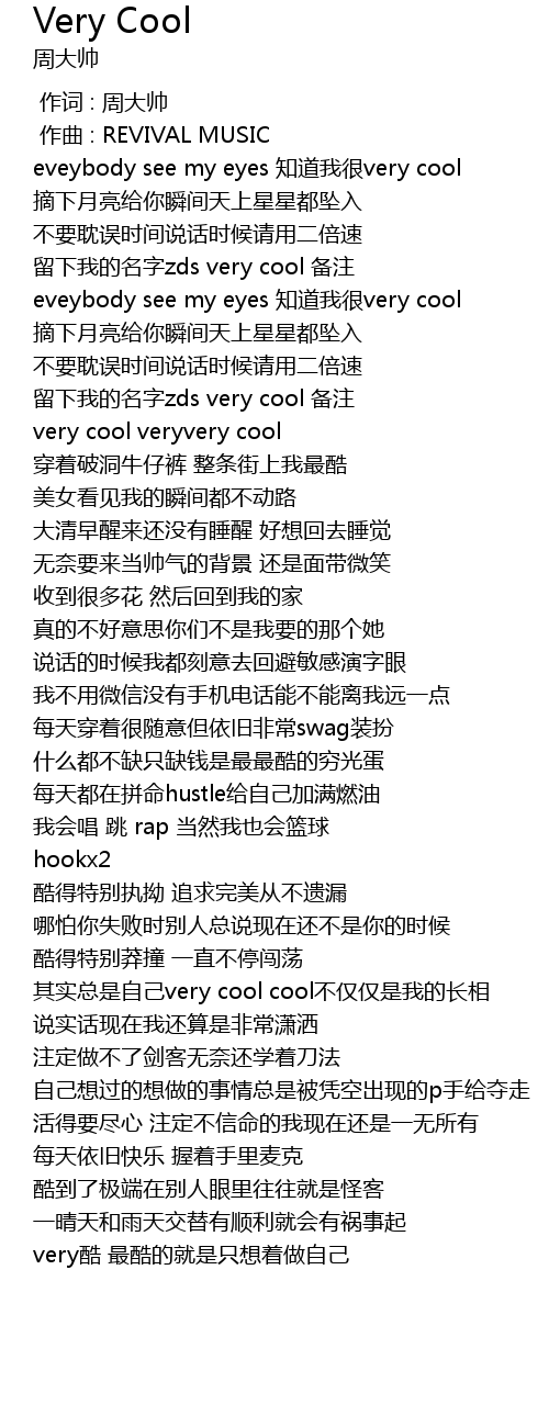 | [00:14.483] | eveybody see my eyes zhī dào wǒ hěn very cool |