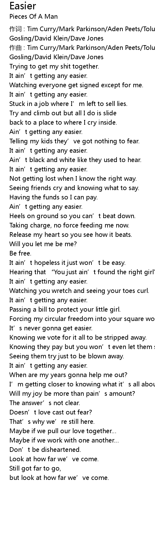 | It ain' t getting any easier. | |