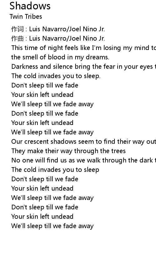 | [02:19.316] | Don' t sleep till we fade |