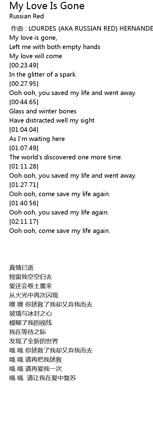 | [00:00.00] | 作曲 : LOURDES (AKA RUSSIAN RED) HERNANDEZ GONZALEZ |