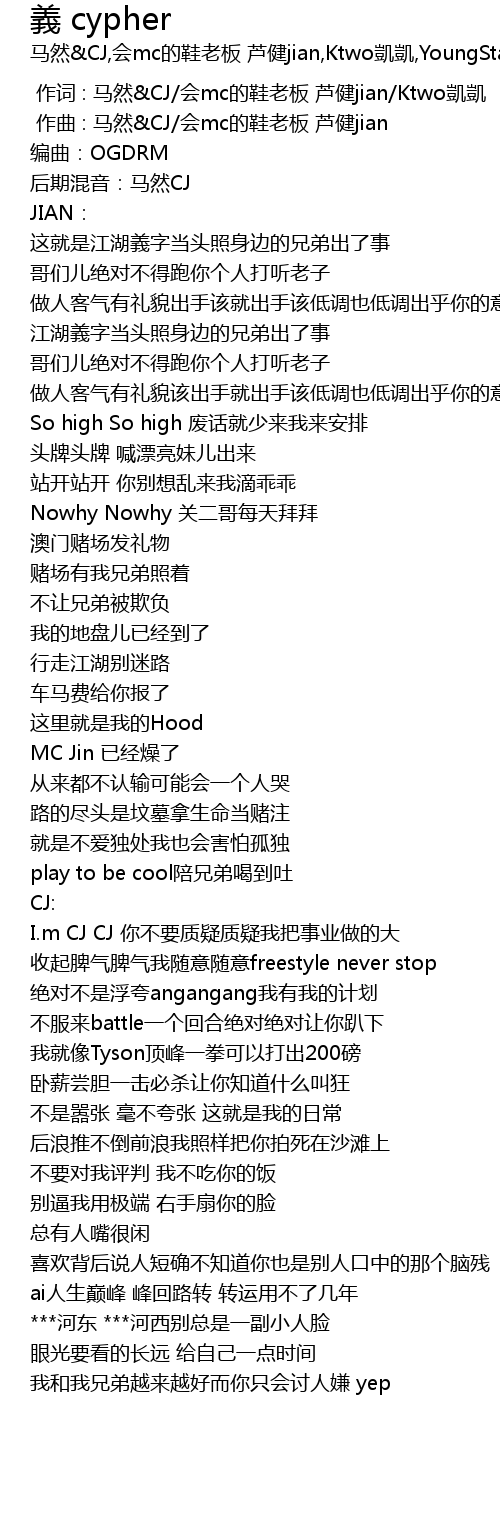 | [00:00.000] | 作词 : 马然&CJ/会mc的鞋老板 芦健jian/Ktwo凱凱 |