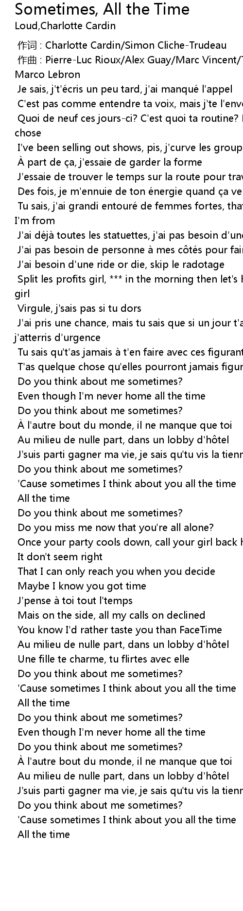 | [01:21.495] | 'Cause sometimes I think about you all the time |