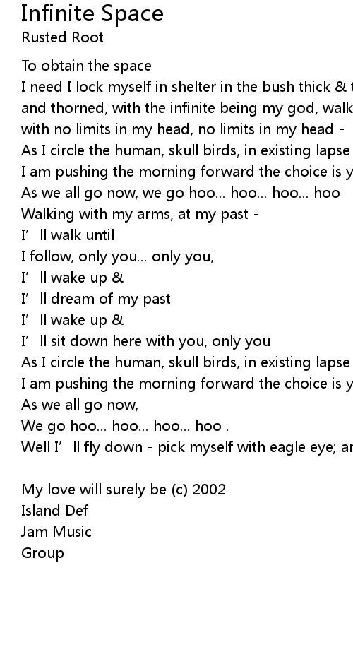 | I need I lock myself in shelter in the bush thick thorned, in the bush thick and thorned, with the infinite being my god, walking with the great and vast with no limits in my head, no limits in my head | |