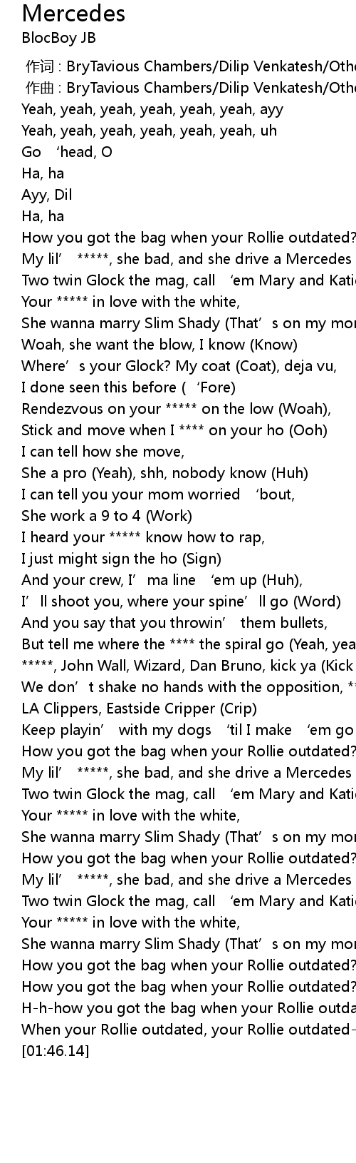 | [01:21.83] | My lil’ *****, she bad, and she drive a Mercedes (Skrt) |