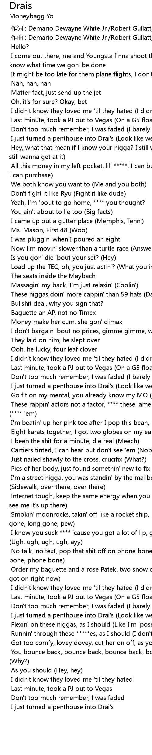 | [02:20.092] | Runnin' through these *****es, as I should (I don't know you) |