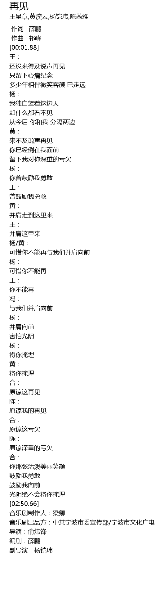 | [02:52.66] | 音乐剧出品方:中共宁波市委宣传部/宁波市文化广电新闻出版局/中共宁波市鄞州区委宣传部/宁波大学音乐学院/宁波市对外文化交流协会 |
