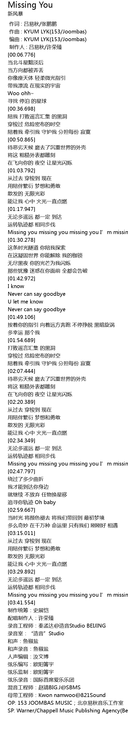 | [02:41.053] | Missing you missing you missing you I' m missing you Baby |
