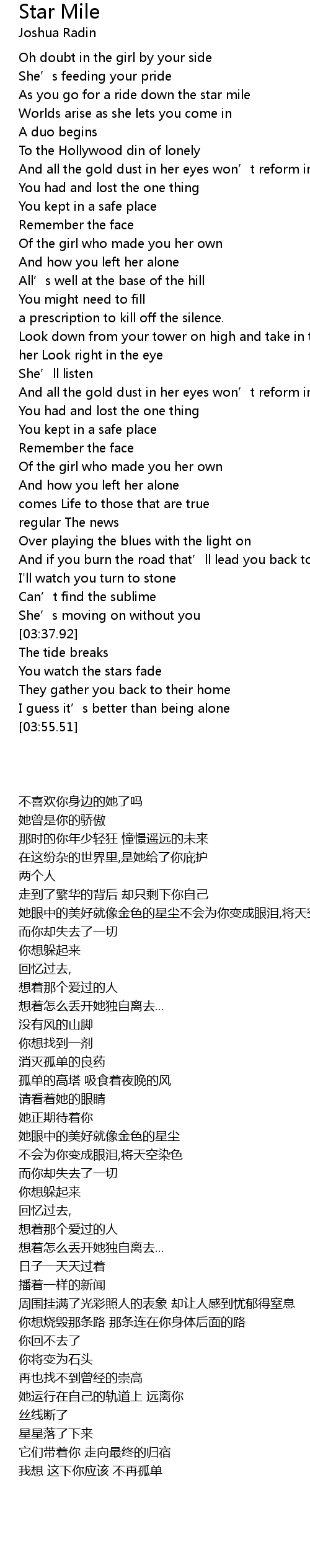 | [00:21.00] | As you go for a ride down the star mile |