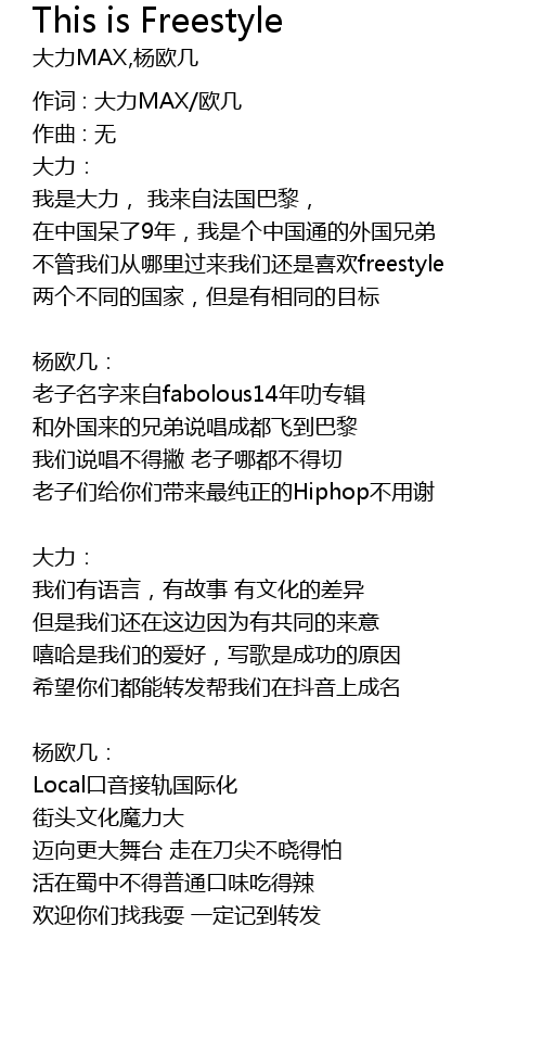 | bù guǎn wǒ men cóng nǎ lǐ guò lái wǒ men hái shì xǐ huān freestyle | |