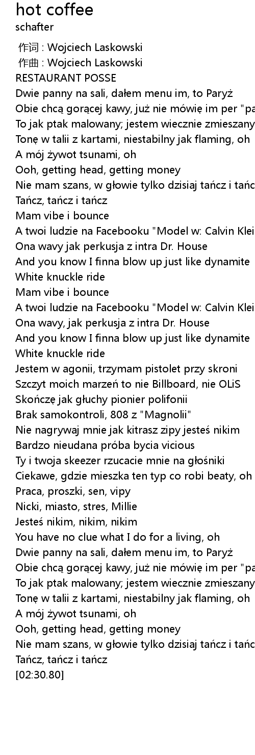 | [00:30.26] | Obie chc gor cej kawy, ju nie mó wi im per " pani" |