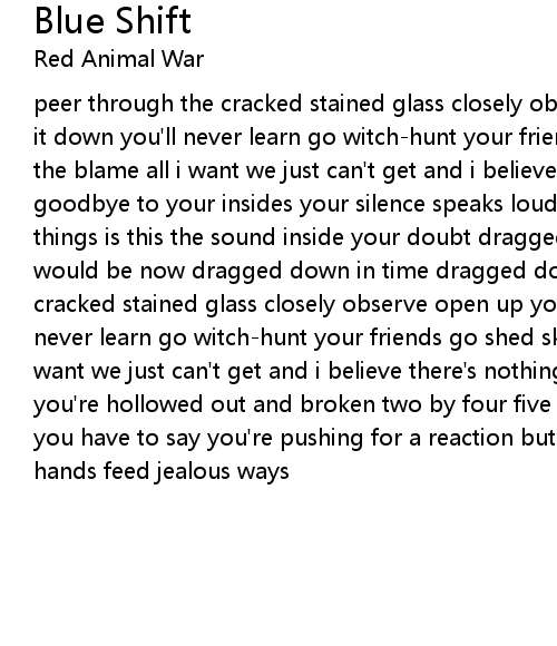peer through the cracked stained glass closely observe open up your mouth follow it down you'll never learn go witch-hunt your friends go shed skin blue shift the blame all i want we just can't get and i believe there's nothing missing say goodbye to your insides your silence speaks loud is this not how you wanted things is this the sound inside your doubt dragged down by all that you said you would be now dragged down in time dragged down tonight peer straight through the cracked stained glass closely observe open up your mouth follow it down you'll never learn go witch-hunt your friends go shed skin blue shift the blame all i want we just can't get and i believe there's nothing missing goodbye inside you're hollowed out and broken two by four five in the morning let's hear what you have to say you're pushing for a reaction but you hold no weight and jealous hands feed jealous ways |