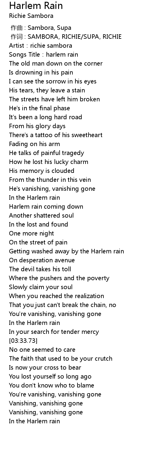 | [03:08.71] | In the Harlem rain |