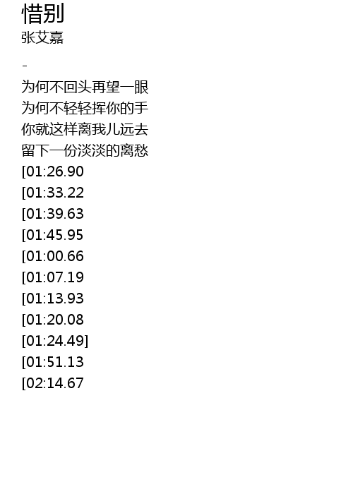 | [02:55.53][01:39.63][00:48.05] | 向你诉说你可不要走 |
