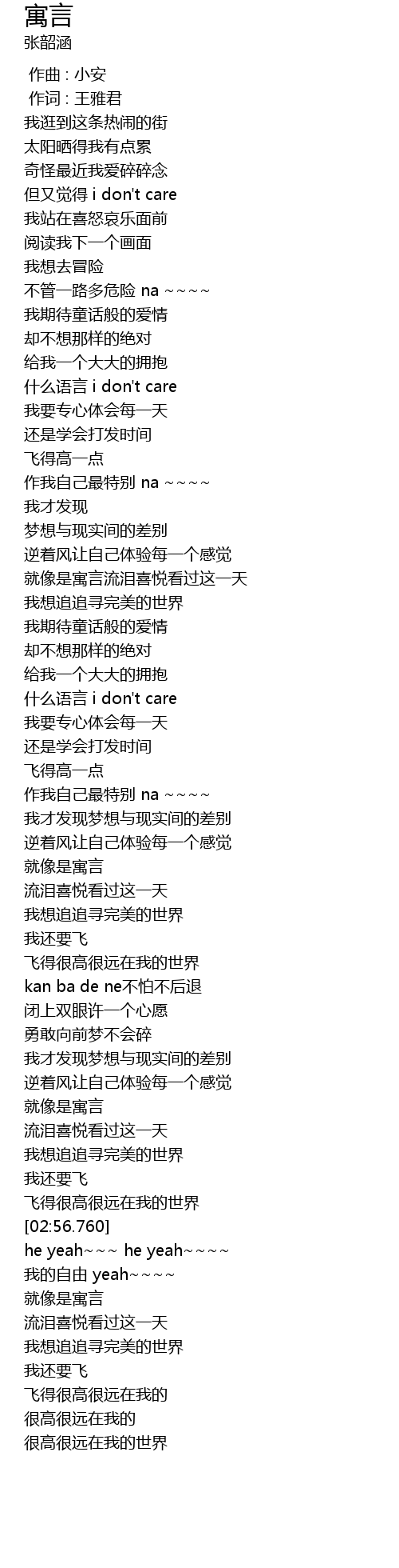 | [01:39.450] | shén me yǔ yán i don' t care |