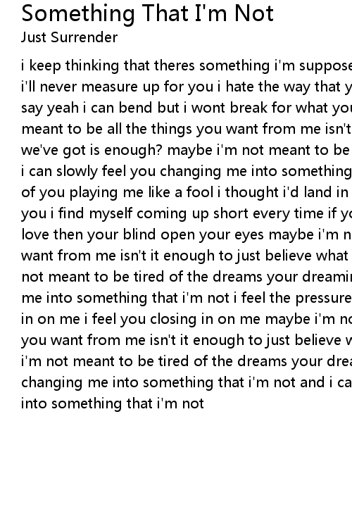 i keep thinking that theres something i'm supposed to do i keep searching but i'll never measure up for you i hate the way that you always have something to say yeah i can bend but i wont break for what you willingly give maybe i'm not meant to be all the things you want from me isn't it enough to just believe what we've got is enough? maybe i'm not meant to be tired of the dreams your dreaming i can slowly feel you changing me into something that i'm not i'm getting tired of you playing me like a fool i thought i'd land in the skies when i aimed at you i find myself coming up short every time if you can't see me standing here love then your blind open your eyes maybe i'm not meant to be all the things you want from me isn't it enough to just believe what we've got is enough? maybe i'm not meant to be tired of the dreams your dreaming i can slowly feel you changing me into something that i'm not i feel the pressure in my life i feel you closing in on me i feel you closing in on me maybe i'm not meant to be all the things you want from me isn't it enough to just believe what we've got is enough? maybe i'm not meant to be tired of the dreams your dreaming i can slowly feel you changing me into something that i'm not and i can slowly feel you changing me into something that i'm not |