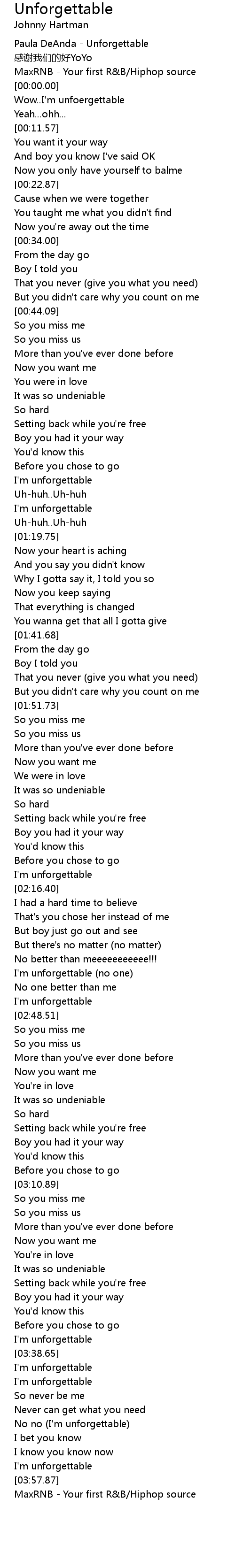 | [03:50.01] | No no I' m unforgettable |