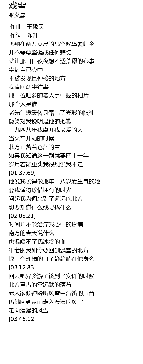 | [03:20.88] | 北方亘古的雪沉默的落着 |