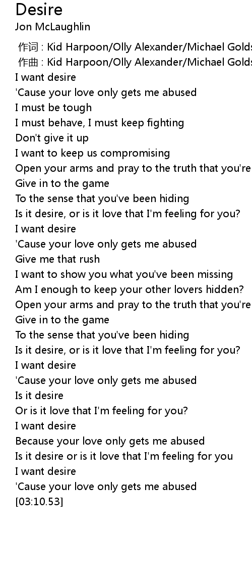 | [00:54.52] | Is it desire, or is it love that I' m feeling for you? |