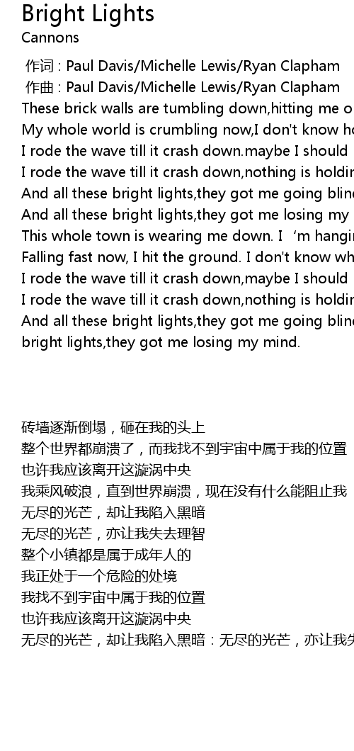 | [01:47.20] | And all these bright lights, they got me going blind. And all these bright lights, they got me losing my mind. |