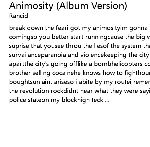 | break down the feari got my animosityim gonna breake it downarmageddon is comingso you better start runningcause the big waveis coming to the shoreno suprise that yousee throu the liesof the system thats rottento the corehigh tech survailanceparanoia and violencekeeping the city at a calmbreak it downtear it apartthe city's going offlike a bombhelicopters coming downon me tonightmy brother selling cocainehe knows how to fighthounded and arrassedin a power elite boughtsun aint ariseso i abite by my routei remember a cold decemberwhen i heard the revolution rockdidnt hear what they were sayingi ran thru the mayhem of a police stateon my blockhigh teck .... |