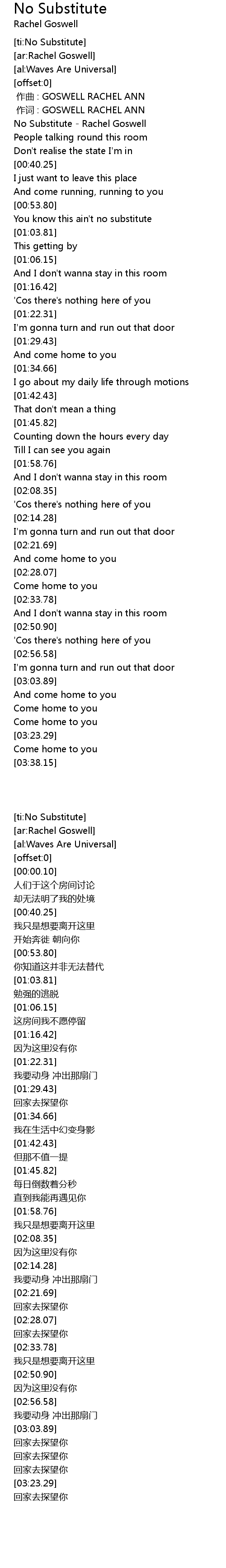 | [00:00.10] | No Substitute - Rachel Goswell |