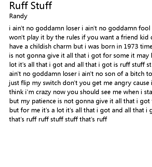 i ain't no goddamn loser i ain't no goddamn fool i ain't no pushover baby i won't play it by the rules if you want a friend kid don't you look at me i may have a childish charm but i was born in 1973 time may be eternal but my patience is not gonna give it all that i got for some it may be nothing but for me it's a lot it's all that i got and all that i got is ruff stuff stuff that's ruff i ain't no goddamn loser i ain't no son of a bitch to find out what i got honey just flip my switch don't you get me angry cause i'm like water on oil if you think i'm crazy now you should see me when i start to boil time may be eternal but my patience is not gonna give it all that i got for some it may be nothing but for me it's a lot it's all that i got and all that i got is ruff stuff stuff that's ruff ruff stuff stuff that's ruff |