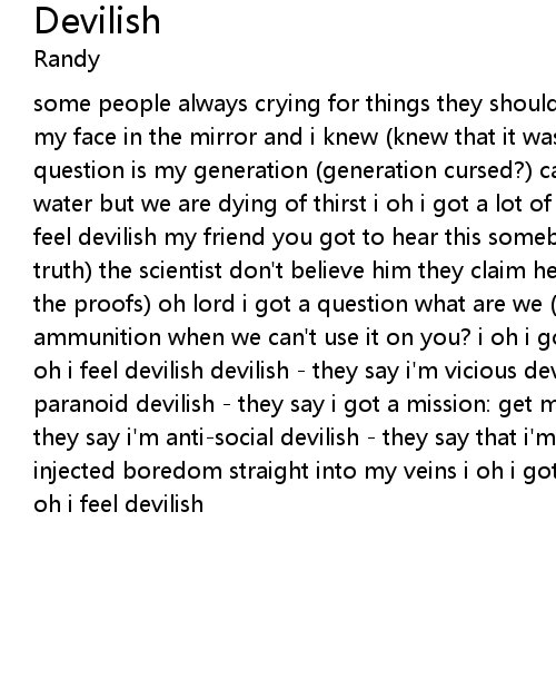 some people always crying for things they should (should or shouldn't do) i saw my face in the mirror and i knew (knew that it was all true) mister i got a question is my generation (generation cursed?) cause we are all swimming in water but we are dying of thirst i oh i got a lot of things on my mind i oh i feel devilish my friend you got to hear this somebody's telling (telling the truth) the scientist don't believe him they claim he aint (claim he ain't got the proofs) oh lord i got a question what are we (suppose to do?) with all this ammunition when we can't use it on you? i oh i got a lot of things on my mind i oh i feel devilish devilish - they say i'm vicious devilish - they say i'm paranoid devilish - they say i got a mission: get myself destroyed devilish - they say i'm anti-social devilish - they say that i'm insane devilish - they injected boredom straight into my veins i oh i got a lot of things on my mind i oh i feel devilish |