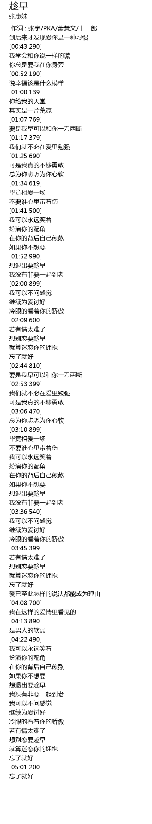 | [00:00.00] | 作词 : 张宇/PKA/蕭慧文/十一郎 |