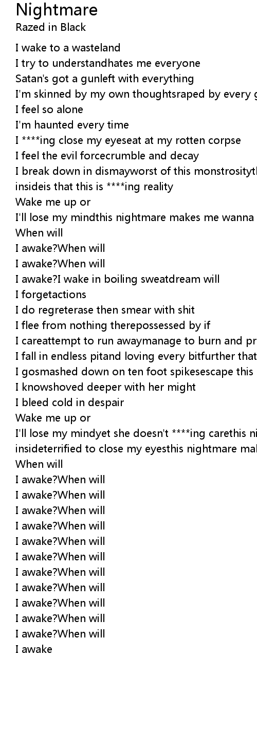 I'll lose my mindyet she doesn't ****ing carethis nightmare's draining me insideterrified to close my eyesthis nightmare makes me wanna die |