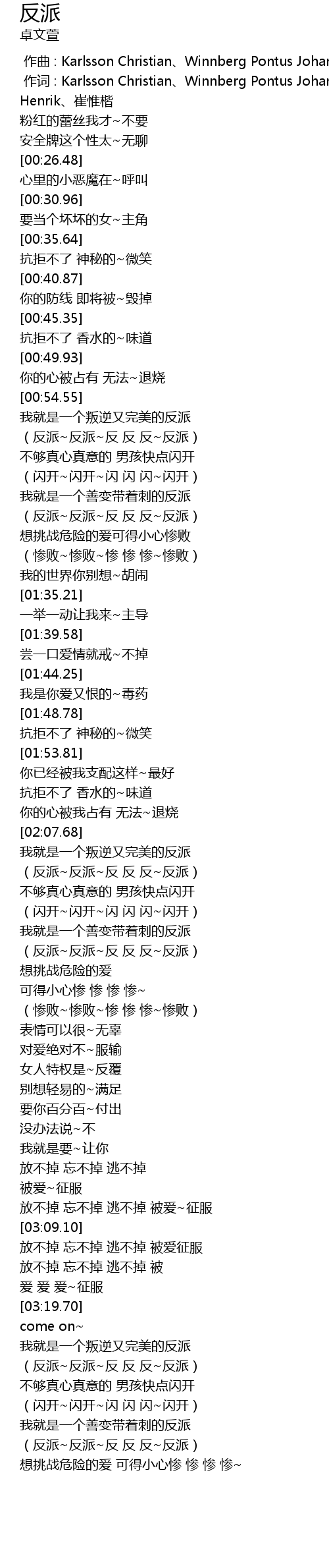 | [00:01.00] | 作词 : Karlsson Christian、Winnberg Pontus Johan、Jonback Henrik、崔惟楷 |
