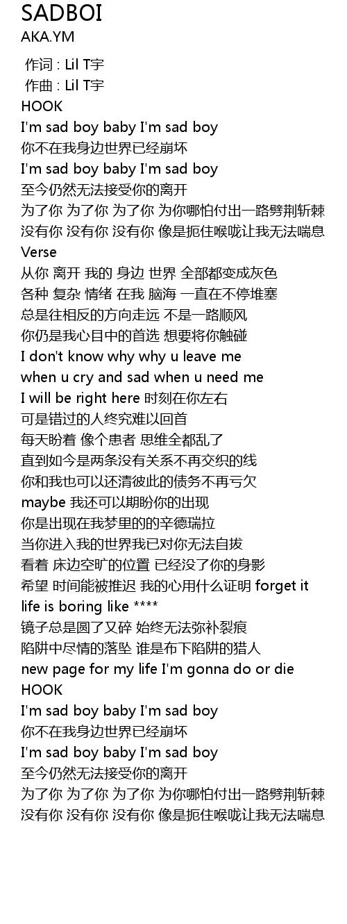 | [00:17.925] | I'm sad boy baby I'm sad boy |
