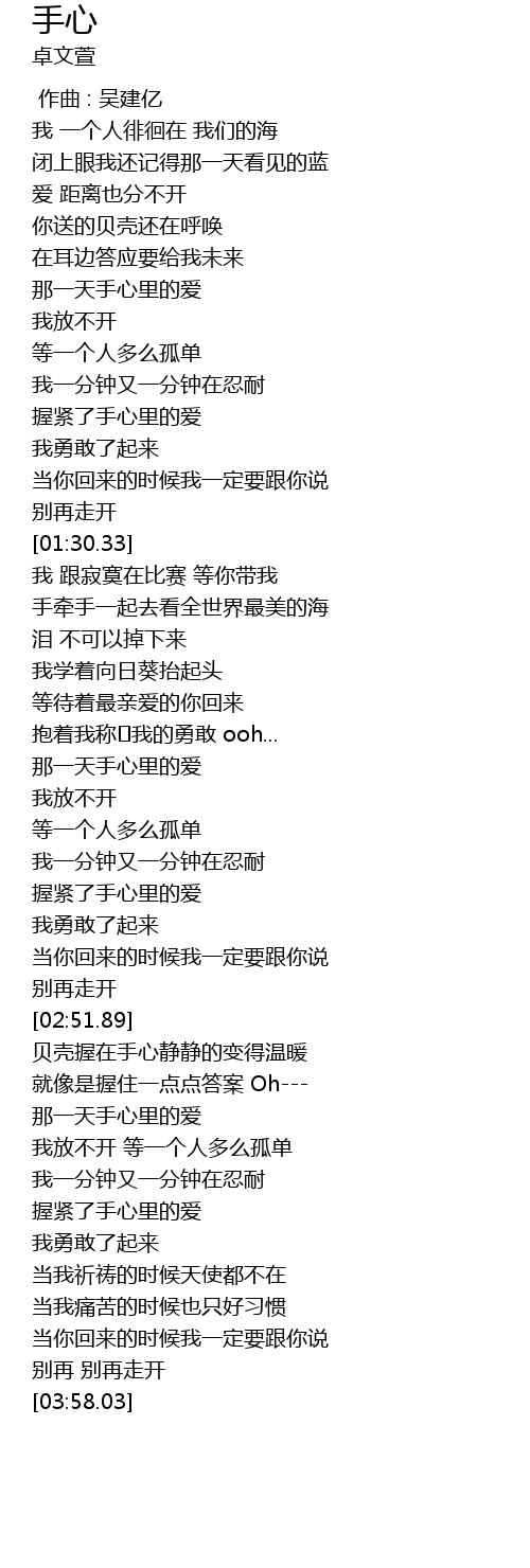 | [03:25.27] | wò jǐn le shǒu xīn lǐ de ài |