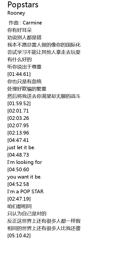 | [04:59.99][04:52.58][04:45.07][04:37.53][04:30.13][04:22.70][04:15.53][04:11.76][04:08.08][04:04.22][03:59.95][03:52.72][03:45.07][03:37.50][02:45.25][02:37.68][02:30.01][02:22.81] | And I' m a POP STAR. |