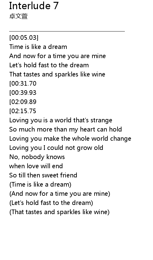 | [02:22.15][02:09.89][00:44.10] | What seem like an interlude now |