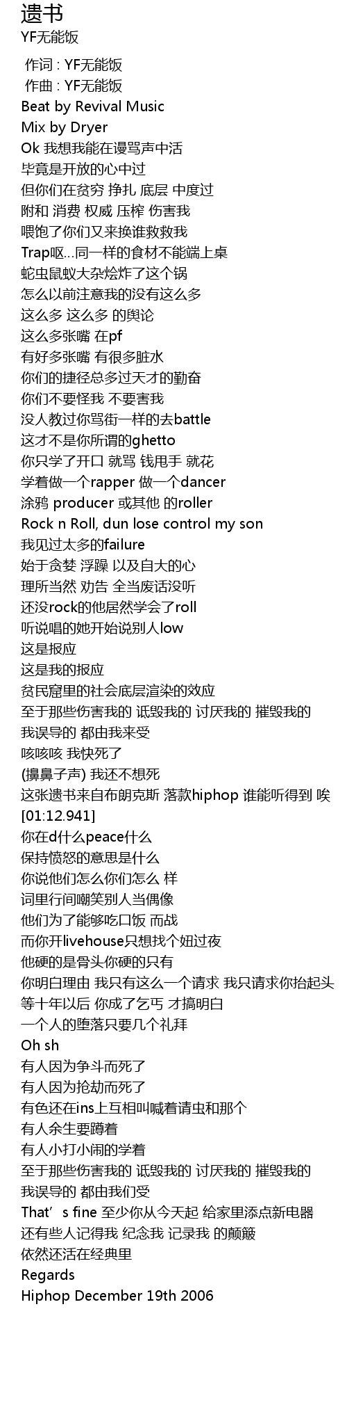 | [01:09.690] | 这张遗书来自布朗克斯 落款hiphop 谁能听得到 唉 |