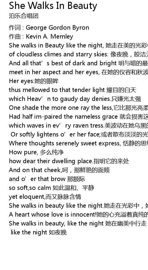 | She walks in beauty like the night. tā zǒu zài guāng cǎi zhōng, rú yè wǎn | |