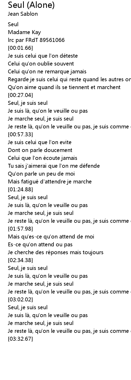 | [03:14.40] | Je marche seul, je suis seul |